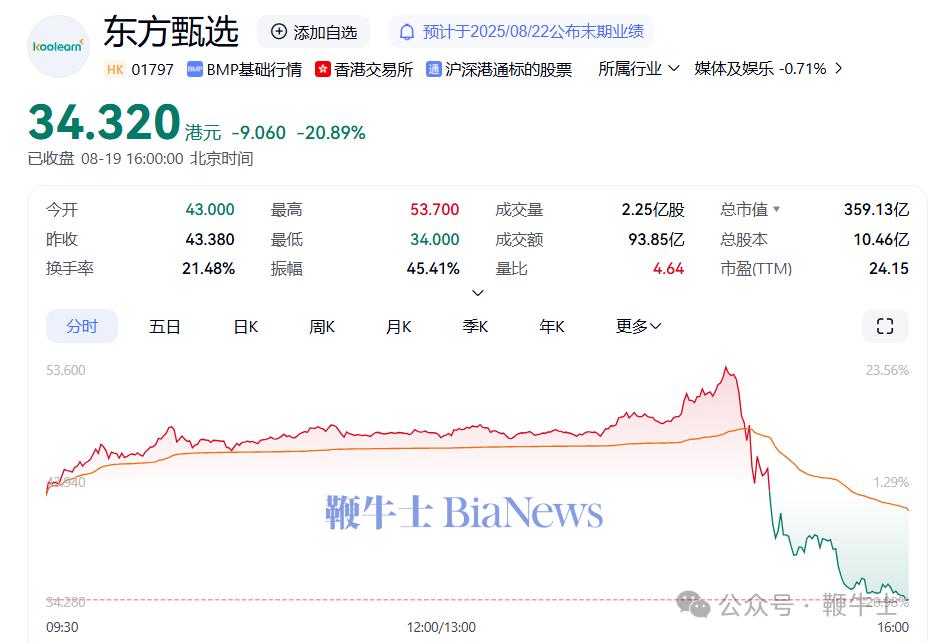 截至收盘,东方甄选跌20.89%,报34.32港元,振幅45.41%,成交金额93.85亿港元。