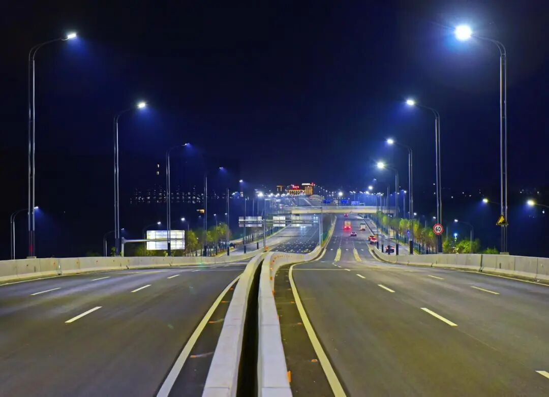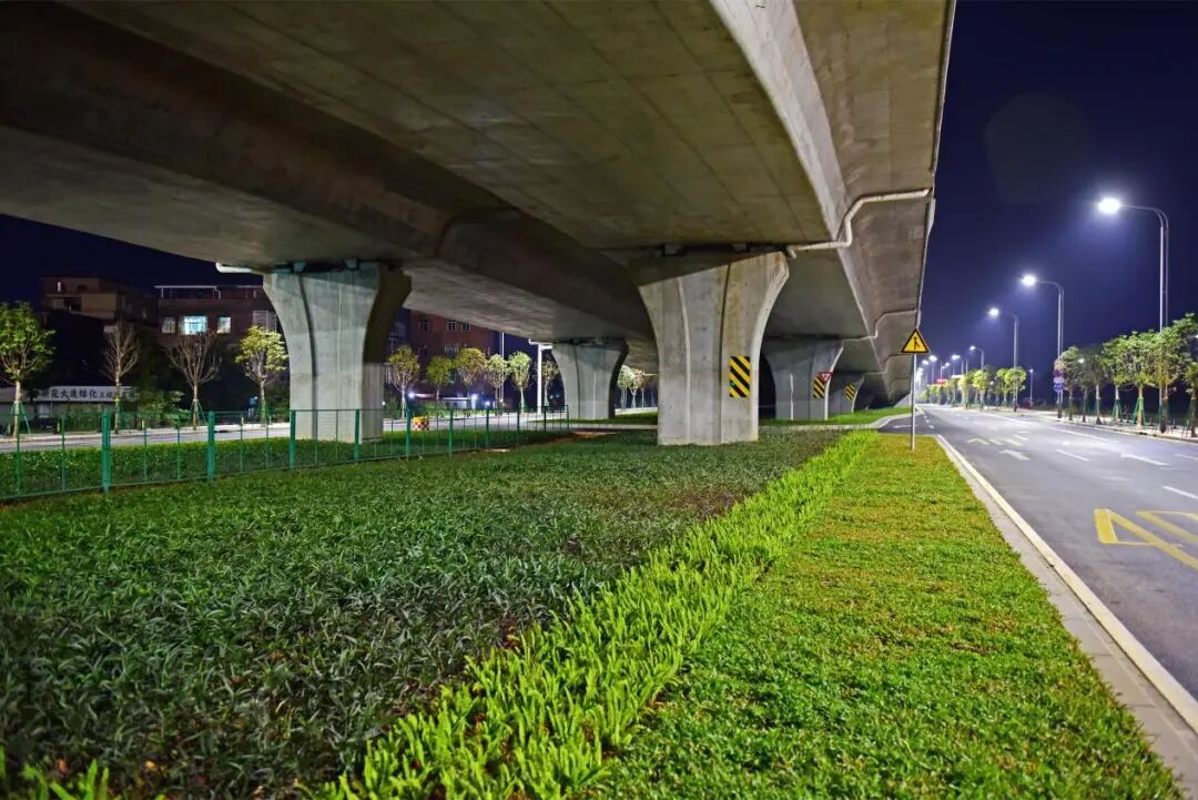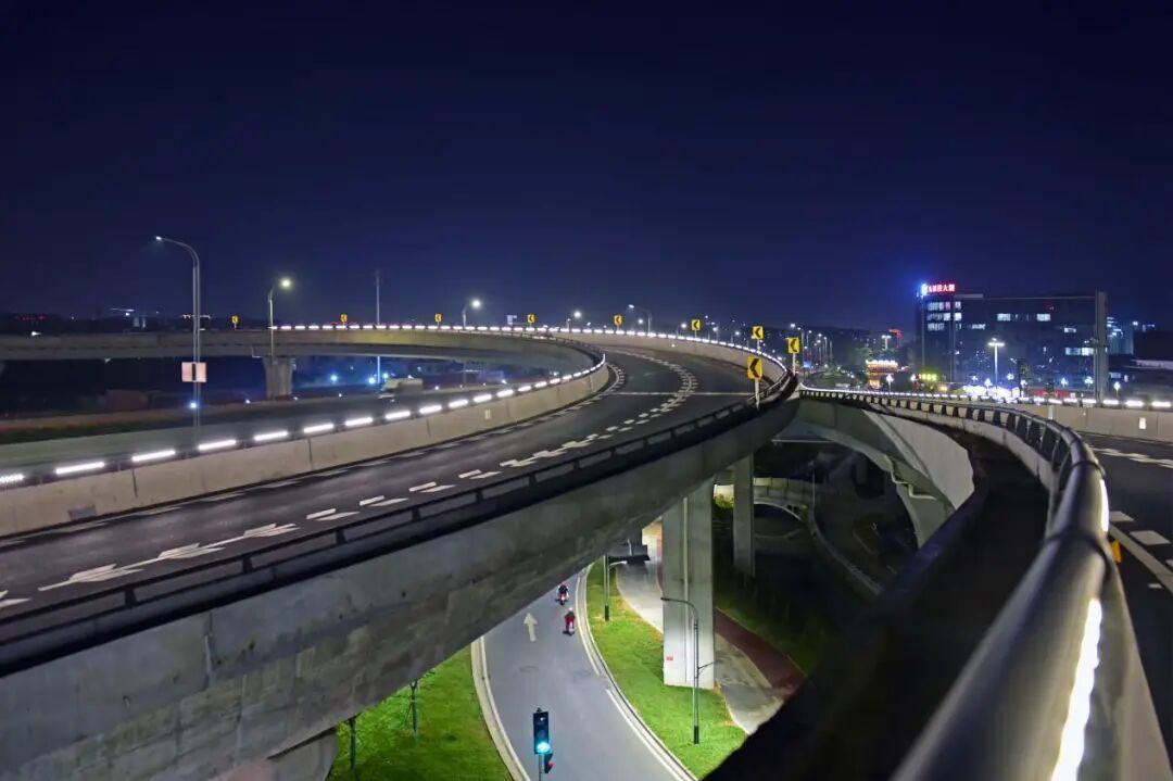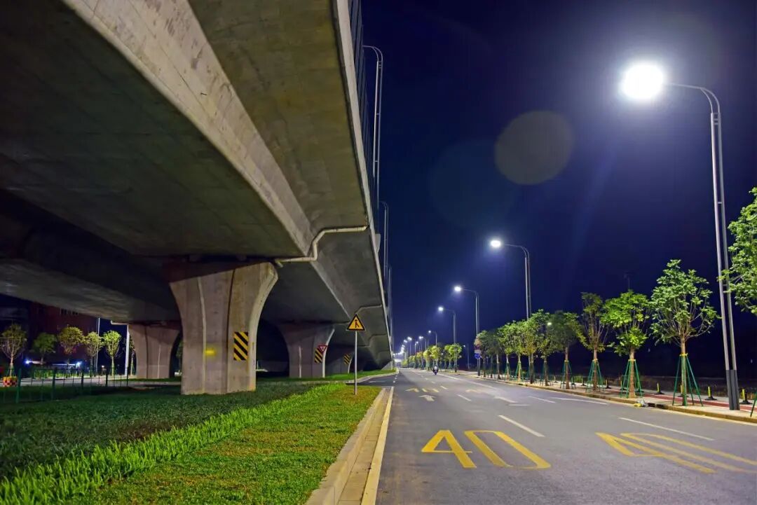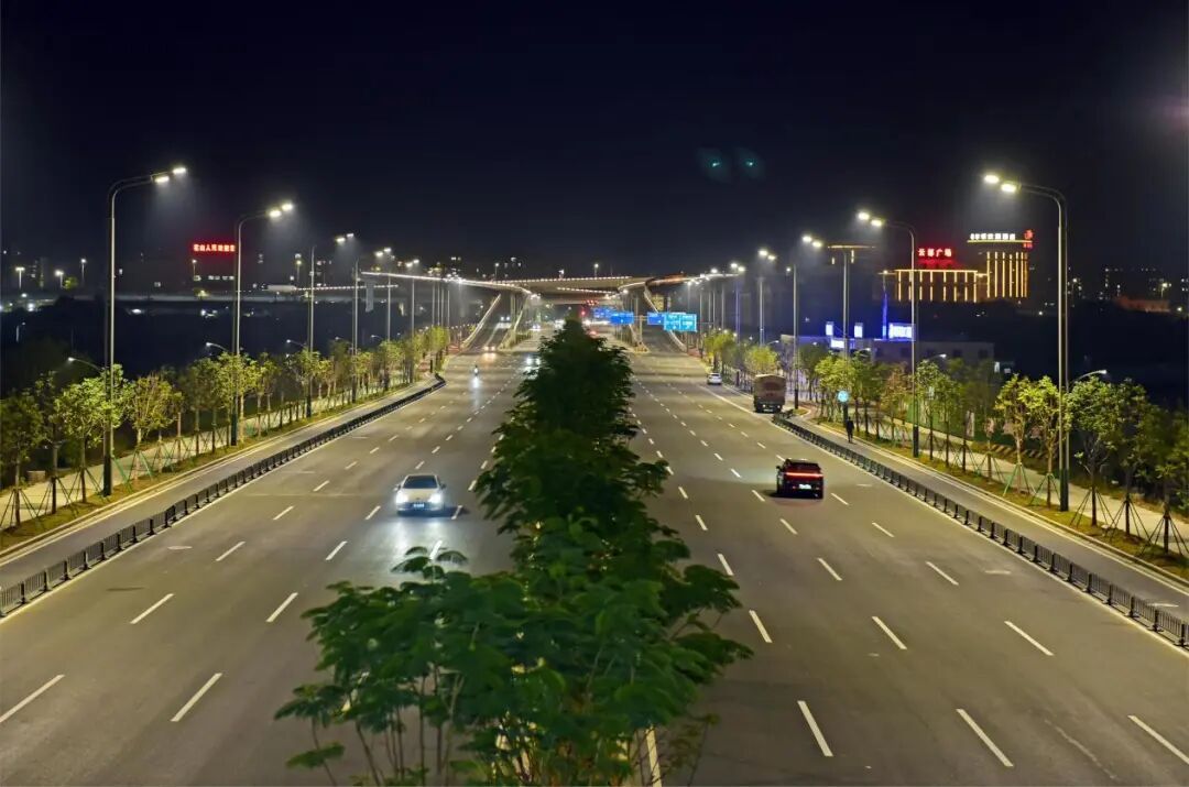 新花大道(花都大道-商业大道)主线运用高杆节能照明灯并配备智能控制系统,可以实现对路灯的整体控制;与花都大道交接的匝道处使用护栏灯,光亮但不刺眼。近看,光影柔和,勾勒出道路的流畅线条;远望,则成一幅浩然的夜色画卷:天幕蓝韵静谧,道路铺展为车流有序的金色光河,周边楼宇灯火如星辰散落,三者交融——天际沉静、道路川流、建筑闪烁,共同呈现出花都深稳澎湃的新气象。