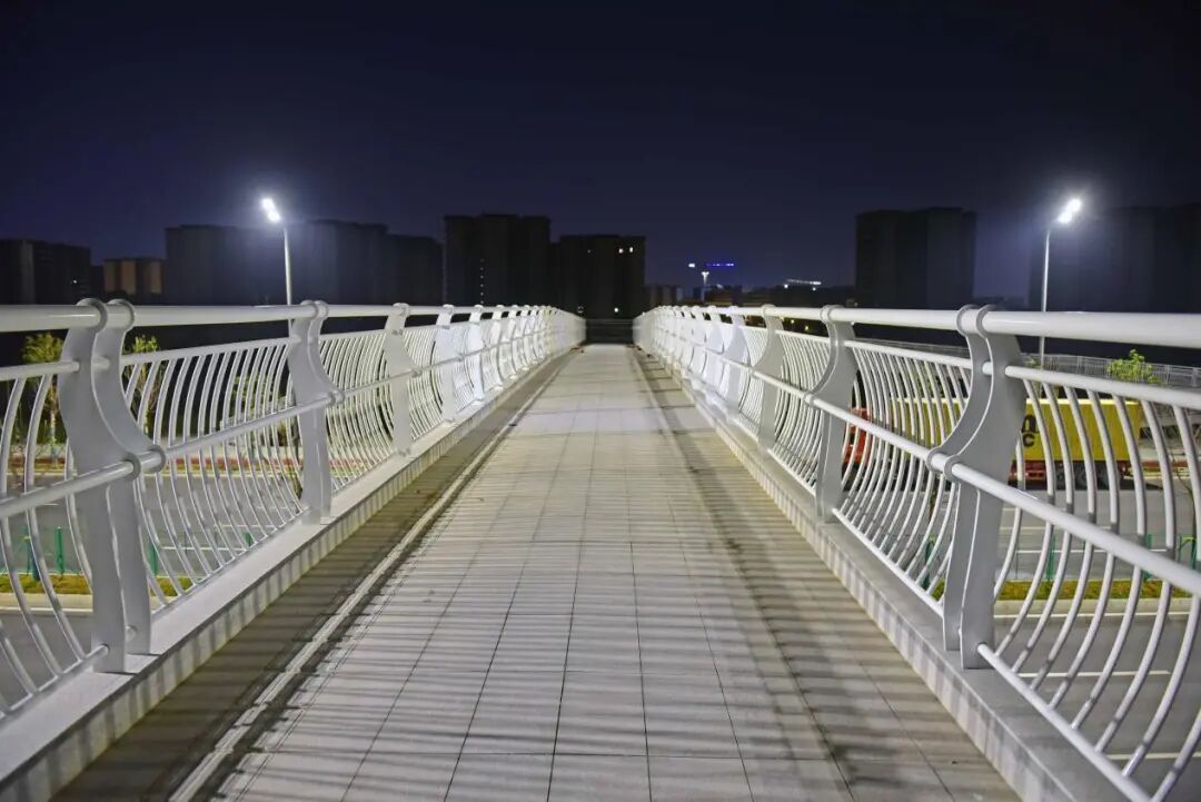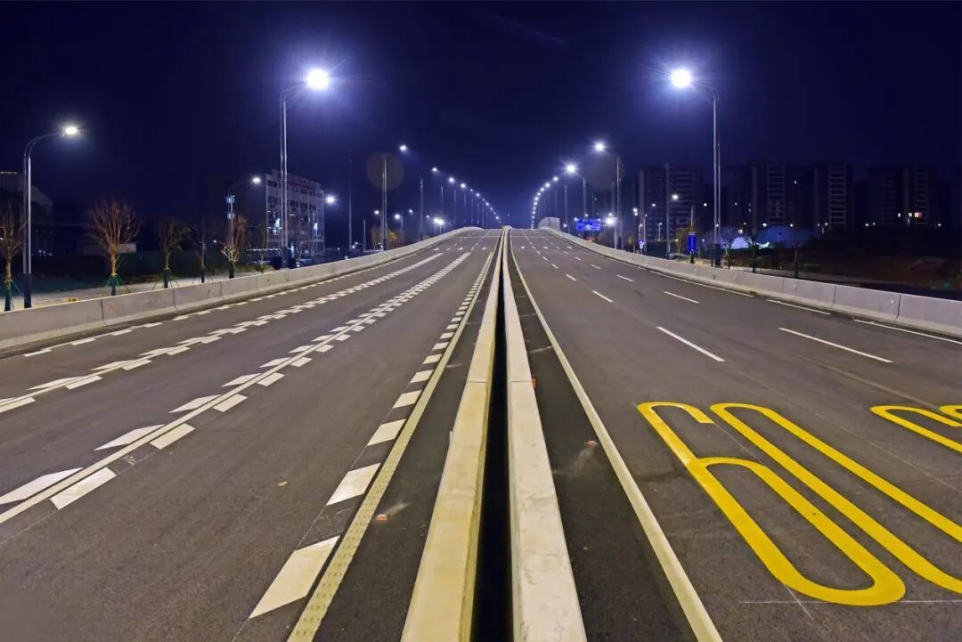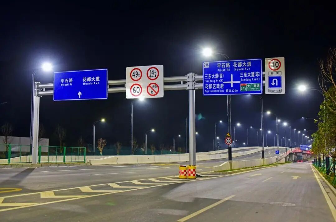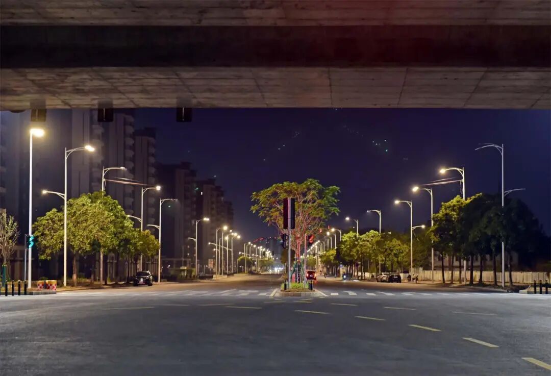 新花大道(花都大道-商业大道)主线运用高杆节能照明灯并配备智能控制系统,可以实现对路灯的整体控制;与花都大道交接的匝道处使用护栏灯,光亮但不刺眼。近看,光影柔和,勾勒出道路的流畅线条;远望,则成一幅浩然的夜色画卷:天幕蓝韵静谧,道路铺展为车流有序的金色光河,周边楼宇灯火如星辰散落,三者交融——天际沉静、道路川流、建筑闪烁,共同呈现出花都深稳澎湃的新气象。