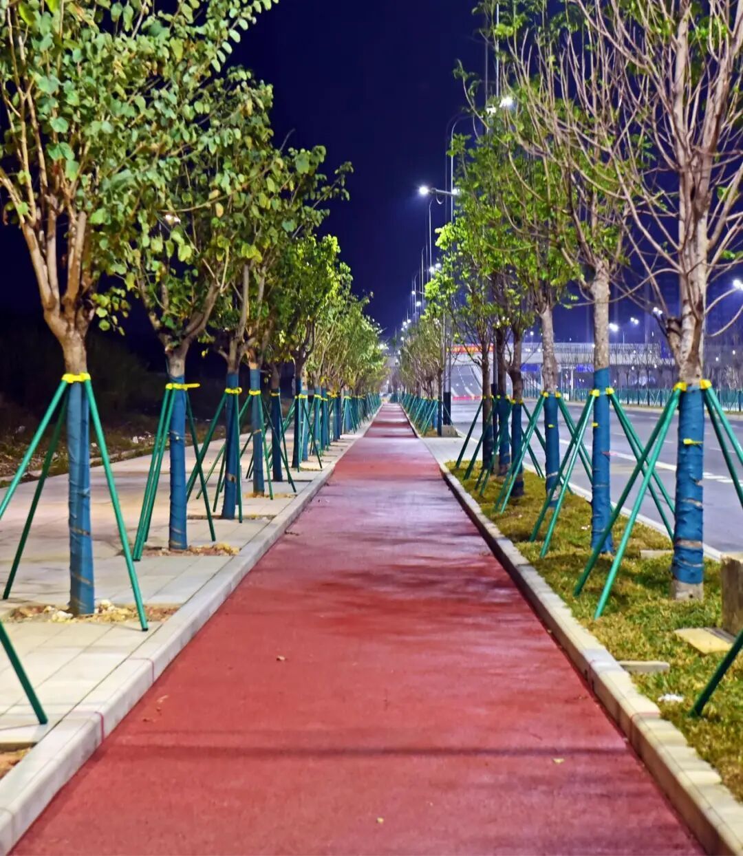 新花大道(花都大道-商业大道)不仅是一条交通干道,更是一条生态景观廊道。沿线绿化工程精选本土适生乔木,道路中线以凤凰木、苦楝为主,道路两侧以仁面子和宫粉紫荆为主,同时搭配翠芦莉、肾蕨、紫花勒杜鹃盆摘等植物,形成了“一路通行,场景鲜明”的景观特点——绿树高大、地被低伏,层层递进;四季色盘实现从春粉、夏红流转到秋紫、冬青的多彩变幻,绚烂而静谧。这一立体画廊有效提升了城市形象与生态品质,展现了现代化花都的独特魅力。