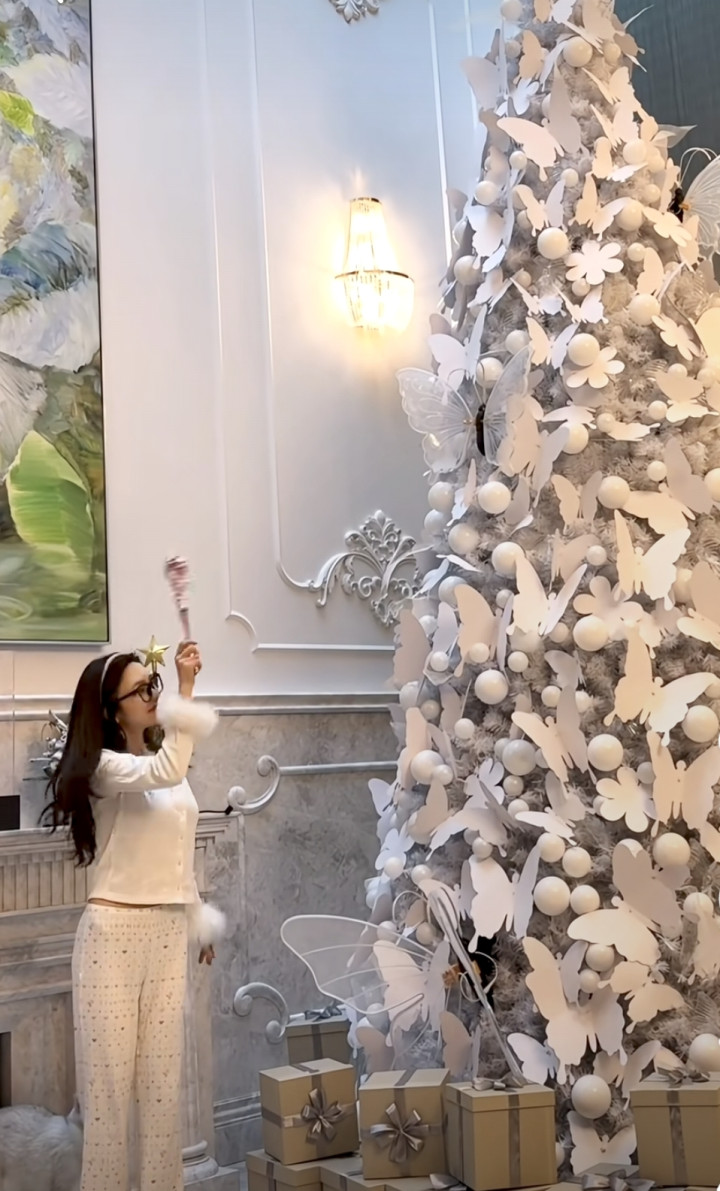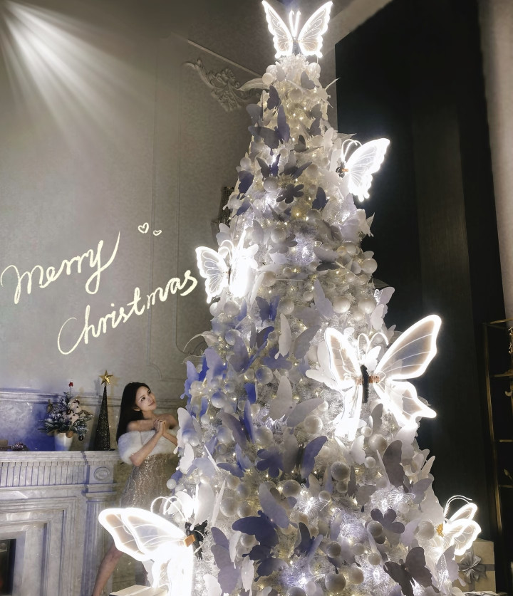 这棵巨型圣诞树在周扬青豪宅的客厅处,今年采用的是全白色系,整棵圣诞树都装满了蝴蝶亮片,在圣诞树到的皱周围还装了几个很大的会发光的蝴蝶,通上电就会闪闪发光,特别漂亮。