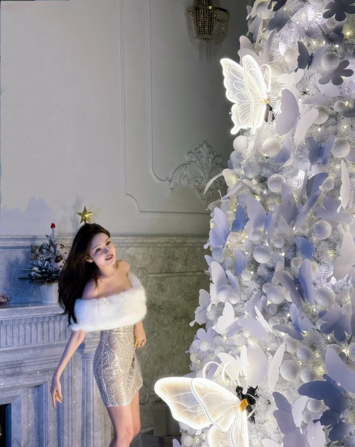 周扬青还对着圣诞树跳舞,每年装饰了不一样的主题圣诞树,周扬青的打扮也会对应上,今年白色主题,她就穿了银白色短裙,氛围感拉满。