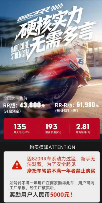据悉,820RR 官方宣传海报早已明确标注:该车动力性能强劲,新手难以驾驭;为保障骑行安全,驾龄不满一年的消费者严禁购买。