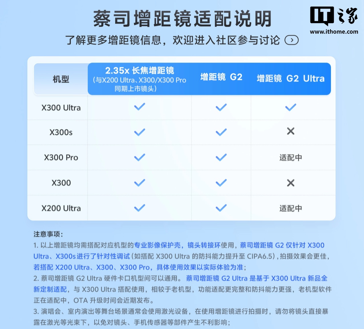 机型2.35x 长焦增距镜 (与 X200 Ultra、X300 / X300 Pro)增距镜 G2增距镜 G2 UltraX300 Ultra✓✓✓X300s✓✓✘X300 Pro✓✓适配中X300✓✓✘X200 Ultra✓✓适配中睿迎网提示:文章来自网络,不代表本站观点。