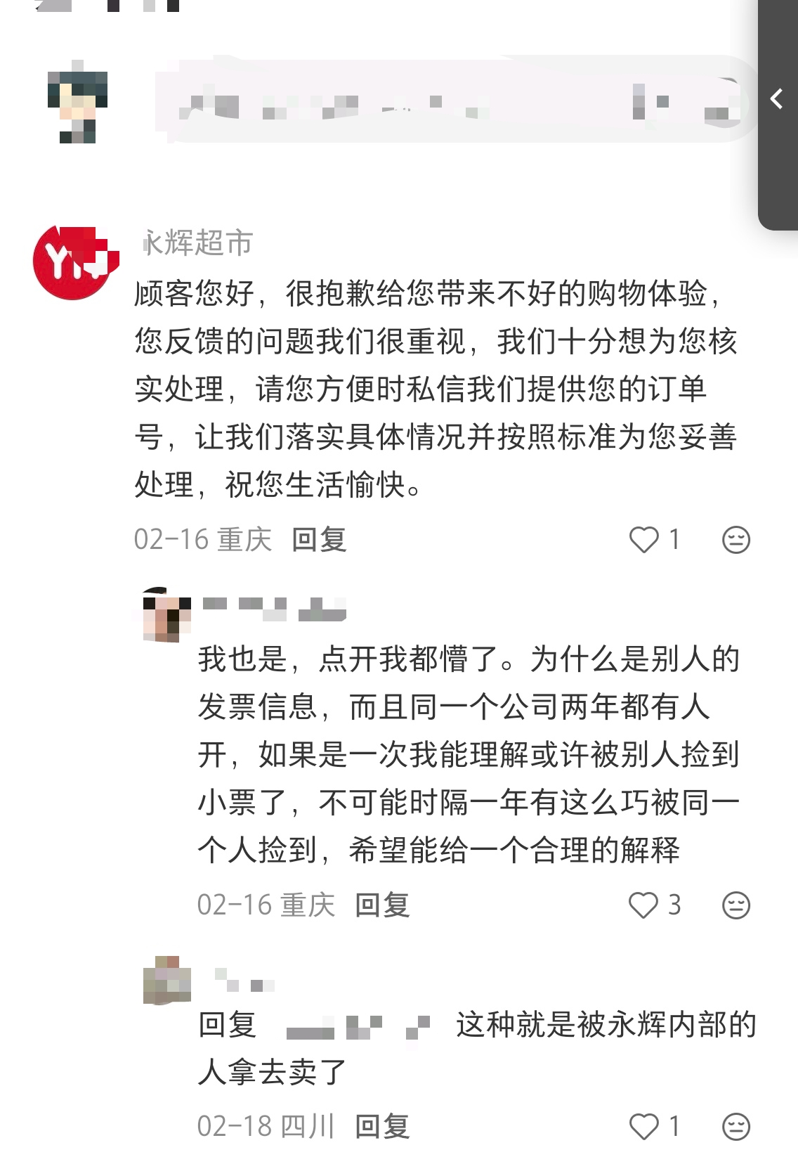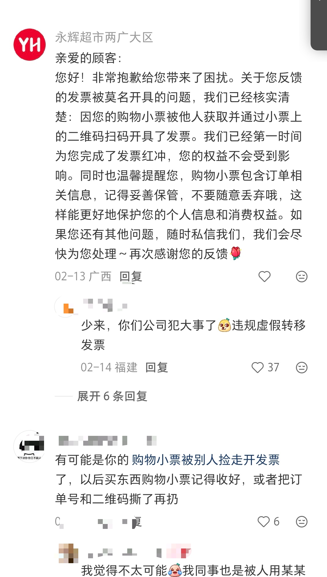其中,小红书账号“永辉超市两广大区”回复称:“关于您反馈的发票被莫名开具的问题,我们已经核实清楚:因您的购物小票被他人获取并通过小票上的二维码扫码开具了发票。我们已经第一时间为您完成了发票红冲,您的权益不会受到影响。同时也温馨提醒您,购物小票包含订单相关信息,记得妥善保管,不要随意丢弃哦,这样能更好地保护您的个人信息和消费权益。如果您还有其他问题,随时私信我们,我们会尽快为您处理~再次感谢您的反馈。”